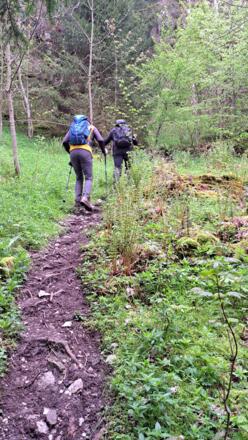 Direkt am Parkplatz zweigt der Weg nach links in den Wald ab. Von Anfang an geht es auf einem breiten Weg zügig bergauf, der paralell dem Bachverlauf verläuft. Nach kurzer Zeit erreichen wir auch schon einen kleinen Wasserfall. Immer weiter führt uns nun der schmaler werdende Pfad zügig nach oben, wärend wir immer wieder den Bachverlauf queren. Erst kurz vor erreichen des Grüntenhaus verlassen wir den Wald und auch die Steigung flacht ab. Ab dem Grüntenhaus erwartet uns ein kleiner Aufschwung auf einem guten und breiten Pfad der uns zur Bergstation bringt. Ab hier zieht sich der Weg fast eben bis zum Gipfel hin. Beim Abstieg über die Obere Schwandalpe erwatet uns ein guter Pfad. Zuerst geht es auf einem sehr breiten Gratrücken abwärts, ehe wir ihn schon nach kurze Zeit nach süden in den Hang verlassen. Aus einem Wechsel zwischen Wald und Wiesen folgen wir dem Pfad in gemächlichem Gefälle Richtung Tal. Nach der Oberen Schwandalpe verläuft der doch breite Pfad in kurzen Serpentinen und anschließend weiten Bögen über Wiesen ins Tal. Kurz vor der Kehr-Alpe wechselt der Pfad zu einem Fahrweg, ehe er bi der Kehr-alpe zu einer Teerstraße wird. Dieser folgen wir talwärts nach Südwesten bis zu unserem Parkplatz.