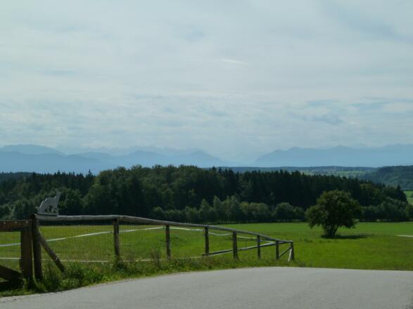 In Ödenpullach aufpassen, hier folgen wir nicht der Beschilderung Deininger Weiher, sondern radeln rechts weiter auf der Straße nach Großdingharting. Hier gibt es eine Einkehrmöglichkeit Zum Neuwirt (ebenerdige Toiletten, Türbreite mind. 58 cm). Beim Neuwirt gerade weiter und dann links nach Kleindingharting. In Kleindingharting den Berg steil hoch zur Ludwigshöhe, hier haben wir einen super Blick in die Alpen.