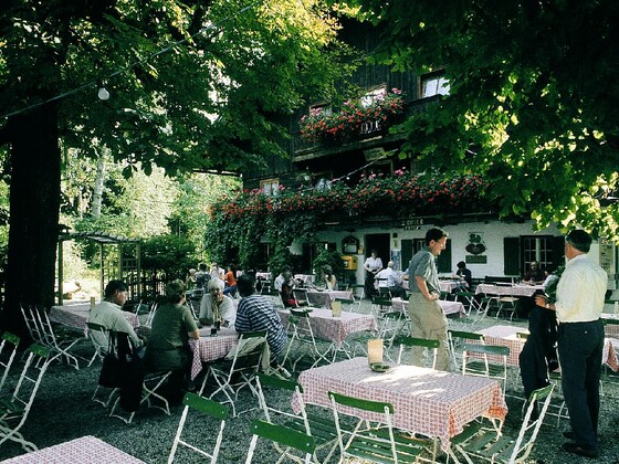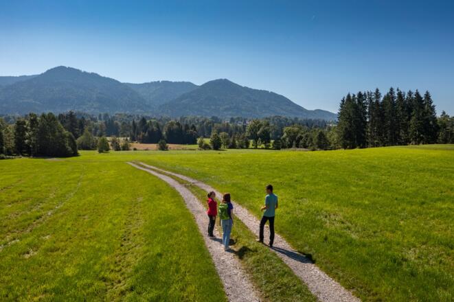 Ein landschaftlich wunderschöner Weg, an dessen Endpunkt besondere Ausblicke warten! Startpunkt ist das Haus des Gastes. Von hier gehen wir kurz in östlicher Richtung entlang der Straße, biegen dann aber gleich nach links ab. Beim Wegkreuz halten wir uns links. Der sanft abfallende Weg durch die Wiesen eröffnet einen schönen Blick nach Norden ins Alpenvorland. Bänke rechts und links des Weges laden zum Verweilen ein. Nach einer Weile, an der Kapelle Maria am Weg vorbei, biegt der Weg vor dem Bauernhof in Obermühl nach links ab. Ein paar Stufen hinab und über den Bach und wir stehen vor der Entscheidung: einkehren oder weitergehen? Allzu verlockend liegt der idyllische Wirtsgarten direkt gegenüber. Wer der Versuchung erfolgreich widersteht, hält sich links, um gleich wieder rechts abzubiegen. An einem Islandpferdehof vorbei und hinein in die leicht hügeligen Wiesen. Hier beginnt der schönste Abschnitt des Weges! Abwechslungsreich wendet sich der Weg mal links, mal rechts und überquert bald einen Bach. Ein Anblick wie aus dem Bilderbuch. Hier sollte sich der Wanderer die Zeit nehmen, um die kleinen und größeren Wunder der Natur in Ruhe zu betrachten. Nach einer Linksbiegung geht der Weg eine Weile auf der Sonnenseite eines schönen Waldrandes vorbei. Schließlich geht es nach rechts durch die Wiese leicht hinauf. Der Blick hier oben ist besonders schön! Zurück zur Ramsau nehmen wir den gleichen Weg. Von hier geht es rechts weiter, dann links zum Schönauer Weiher, wo man im Sommer im gesunden Moorwasser baden kann. Der letzte Abschnitt nach Bad Heilbrunn hinauf ist etwas steiler, geht aber dafür meist schattig im Wald. Am Ortsrand halten wir uns links und erreichen bald den Ausgangspunkt.
