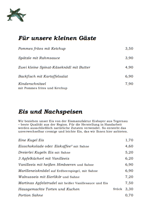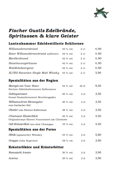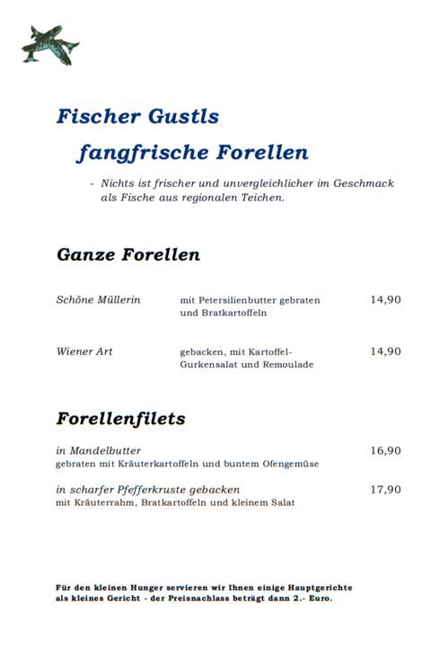 Im Bewusstsein der über 60-jährigen Geschichte des Fischerstüberls wollen wir unsere Familientradition mit Engagement und Herzblut fortführen. Von Anfang an stand beim "Fischer Gust" frischer und regionaler Fisch ganz oben auf der Karte. So soll es auch weiterhin bleiben. Dazu können Sie im Fischerstüberl auf gute bayerische Küche und auf viele vegetarische Gerichte gespannt sein. Bei der Auswahl unserer Zutaten achten wir auf Regionalität und tierwohlgerechte Erzeugung.
