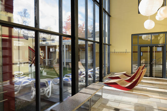 Freizeitbad mit Heißwasseraußenbecken, Panoramaschwimmhalle, Kinderbecken und geräumiger Ruhezone sowie Sauna und Solarium in Kiefersfelden.