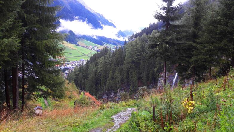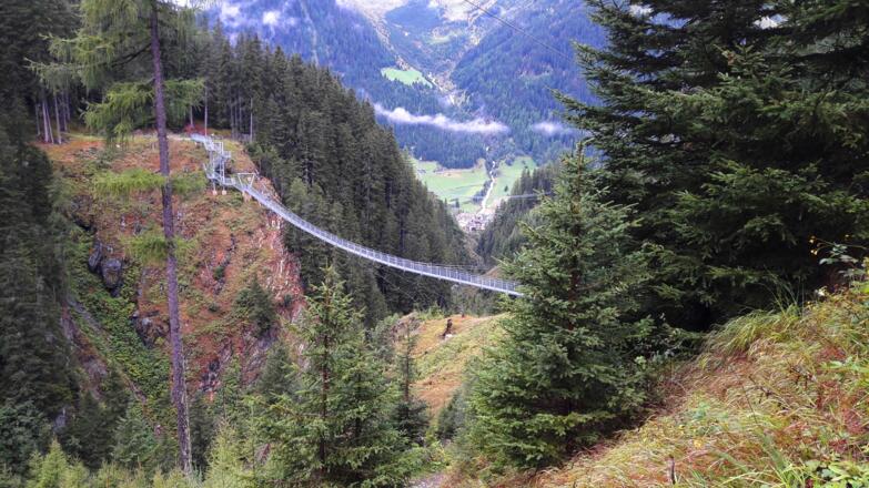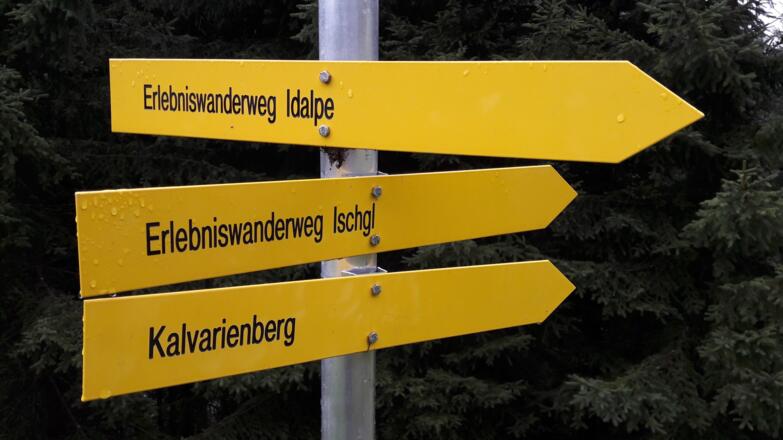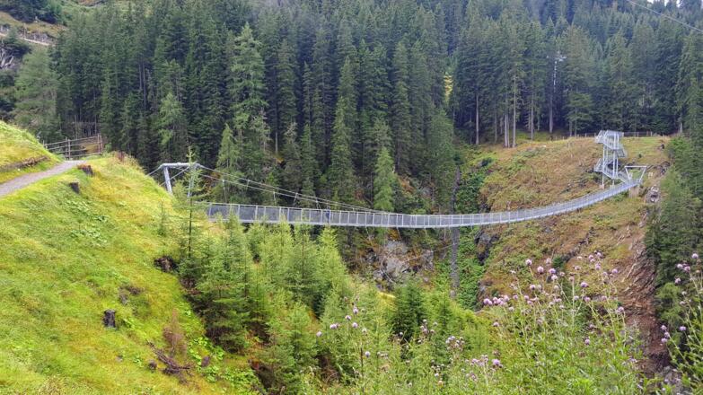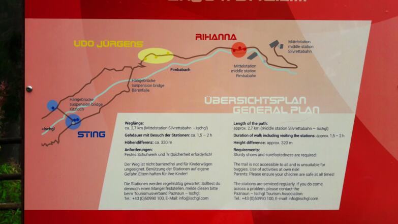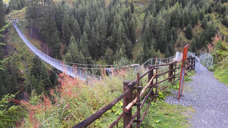 Folgen Sie von der Talstation der Silvretta-Bergbahn zunächst der Dorfstraße. Dann nach rechts in den Kirchweg gehen, an der Kirche vorbei ... und weiter den Berg hoch, bis die Stadtgrenze erreicht ist. Dort treffen Sie auf den Fimbaweg. Richten Sie sich nach den gelben Wegweisern mit der Bezeichnung "Erlebnisweg". Der Fimbaweg bringt Sie im weiteren Verlauf zur 1. Hängebrücke, die Sie überqueren.