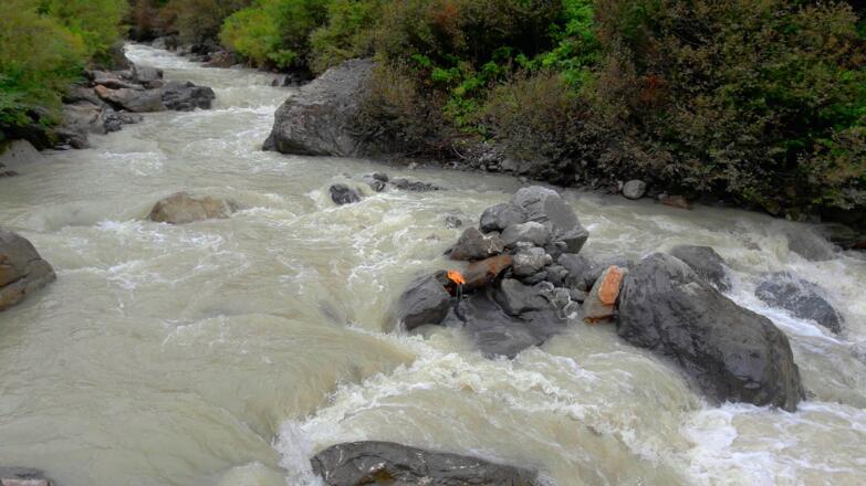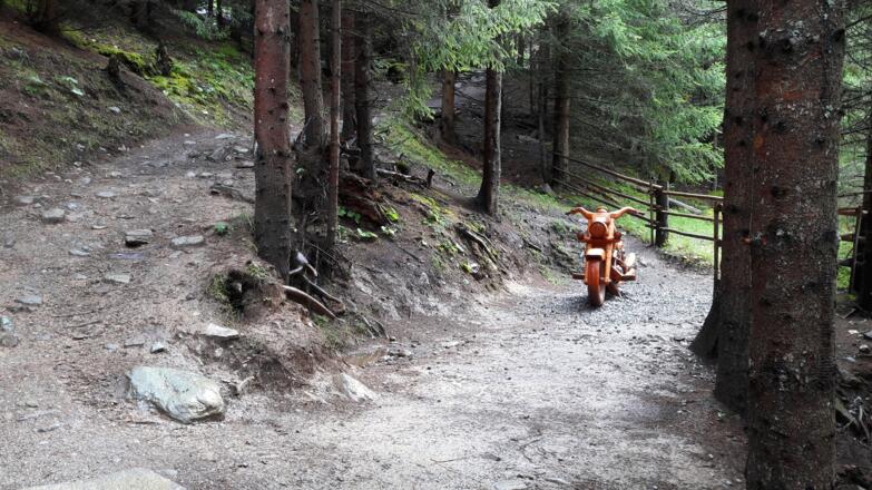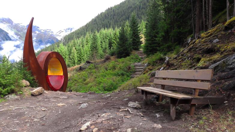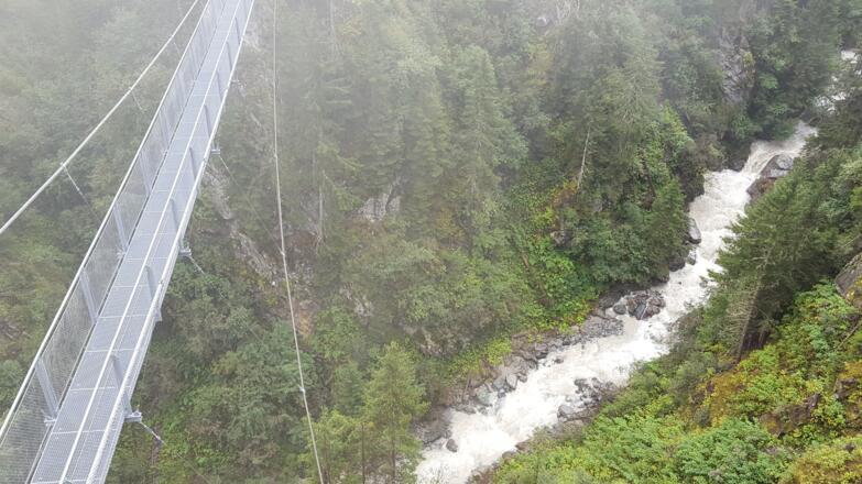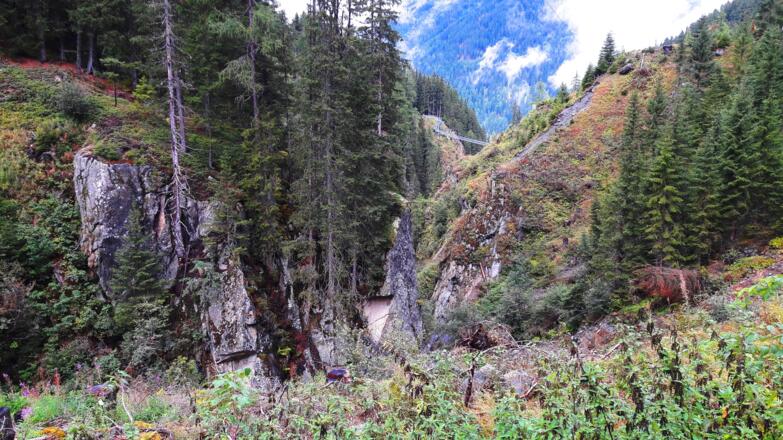 Der Erlebnisweg geht weiter den Berg hoch - der Fimbabach liegt dann rechts von Ihnen. Dabei kommen Sie an der 2. Hängebrücke vorbei. Bleiben Sie jedoch weiter auf dem Erlebnisweg.
