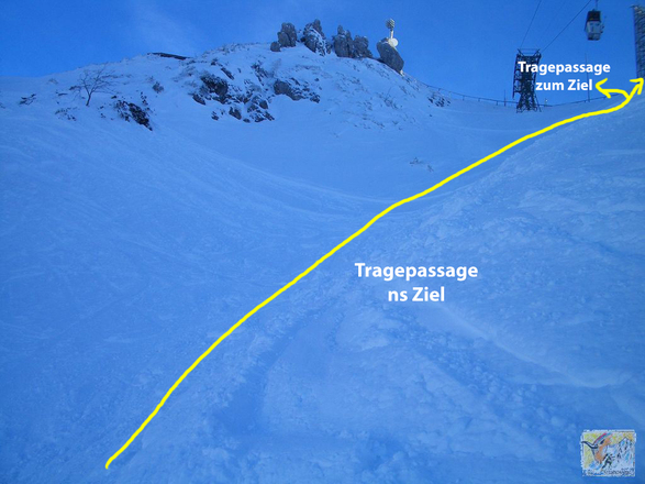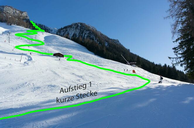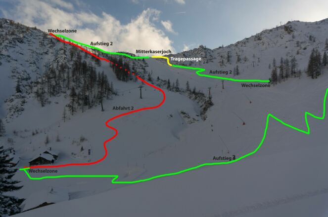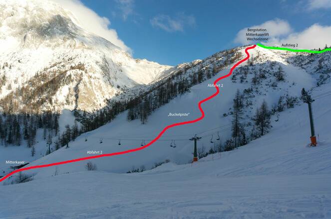 Am rechten Rand der Piste zuletzt in Tragepassage zur Pistenvereinigung an der Mitterkaserschneid. Entlang der Piste zur Bergstation des Mitterkaserlifts (1775 m, 3. Wechselzone)