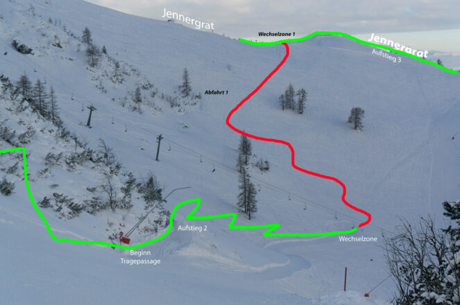 Querung der Skipiste und Aufstieg über den Steilhang (sog. Pulverhang) gegenüber dem Mitterkaser, im oberen Teil wird nach links am Hang entlang zur Piste gequert. Hier am Pistenrand zur Bergstation einer Sesselbahn und einem Rücken (1700 m) folgend zur Wechselzone am Kl. Jenner (1680 m) aufsteigen. Hier auf der Nordseite unterhalb des Jennergrats entlang in den Gr. Spinnergraben queren und über eine abschließende Tragepassage zur Bergstation der Jennerbahn (Ziel, 1800 m) aufsteigen