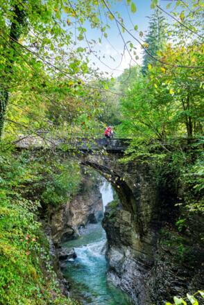 Bei geeignetem Wetter sollte man eine kurze (oder längere) Rast am Wasser einplanen. Wir fahren unter der Straßenbrücke und über das Naturdenkmal Römerbrücke und wenden uns bei der Einmündung in diese stärker befahrene Straße nach rechts. Nach rund 1 km erreichen wir die Kreuzung beim Englhartgut, die rechte Straße führt zur Heiltherme Bad Vigaun, zur Naturthek und zur Hofkäserei Schmiedbauer. Wir halten uns links und fahren durch das Ortszentrum von Bad Vigaun.