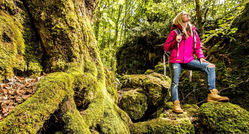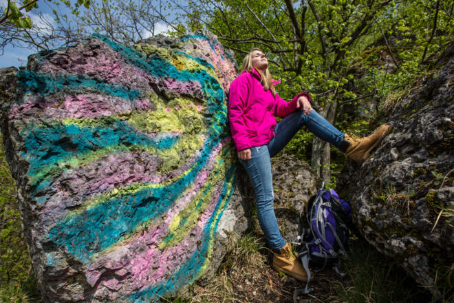 Steil geht es danach zum Zugang der Schauhöhle Maximiliansgrotte hinab, die bei einer geführten Tour besichtigt werden kann. Noch ein paar Meter darunter lädt der GasthofGrottenhof zur ausgedehnten Rast ein. Ein genussvoller Tipp ist dort der Grottenkäse, ein Hartkäse aus Kuhmilch, handgekäst im Grottenhof, geräuchert und mindestens 10 Wochen in der Maximiliansgrotte gereift. Gut gestärkt wandern wir weiter am Hang entlang und schon bald ragen vor uns die Felsen der Weissingkuppe auf. Auf Steintreppen steigen wir zu ihren „Pilzfelsen“ empor. Tonnenschwere Blöcke ragen hier auf Sockeln, die nur wenige Zentimeter Durchmesser aufweisen. Unser Pfad windet sich zwischen Klüften und Felsspalten hindurchund erreicht auf dem Rücken der Weissingkuppe mit 531 Metern den höchsten Punkt unserer Tour.