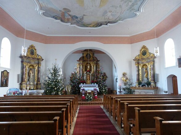 Erste Erwähnung der ursprünglichen Kirche in einem Ablassbrief aus dem Jahr 1438. Trotz mehrmaliger Umbauten und Erweiterungen wurde die Kirche 1928 bis auf den Chorturm abgerissen. Fertigstellung des Neubaus 1929 unter Einbeziehung des ursprünglichen Turms. welcher bereits in der Barockzeit mit der charakteristischer Zwiebelhaube versehen wurde. Die Innenausstattung ist größtenteils barock und stammt teilweise noch aus der ursprünglichen Kirche. (Hochaltar: Gottesmutter Maria; Seitenaltäre: Herz Jesu und St. Willibald; 14 Kreuzwegstationen von 1888)