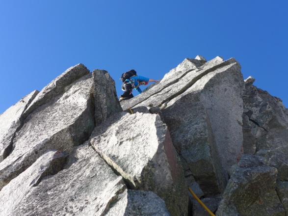 Am Grat angelangt beginnt eine wunderschöne Block- Kletterei im 2. Grat mit meist guter Felsqualität. Der Verlauf zum Gipfel ist logisch und man wird mit eine hervorragenden Aussicht beloht.
