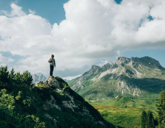 Vom Wanderstartplatz Rüfiplatz nehmen Sie den kostenlosen Wanderbus bis nach Warth. Der Steffisalp-Express bringt Sie bis zur Bergstation. Gleich an der Bergstation geht zweigt links ein Pfad bergauf ab, dem Sie folgen. Sie kommen zu einer Mulde an deren linken Seite der Weg bergauf entlangführt bis zum Sattel. Bevor Sie hier den Weg nach rechts zum Einstieg nehmen, können Sie noch den Gipfel des Warther Horns (2.256 m), quasi im Vorbeigehen mitnehmen. Zweigen Sie dafür beim Sattel links ab und folgen Sie dem markierten Pfad bis zum Gipfel. Retour beim Einstieg ziehen Sie sich ihr Klettersteig Set und den Helm an und folgen dem Klettersteig bis zum Gipfel des Karhorns (2.416 m). Neben schöner Kletterei im II. und III. Schwierigkeitsgrad erwartet Sie ein abwechslungsreiches Panorama, bis hin zu Valluga, Säntis und die Allgäuer Alpen. Der Abstieg erfolgt über die Normalroute bis der Pfad auf dem Karbühel in einen breiteren Weg mündet. Hier können Sie entweder nach links in Richtung Bürstegg und weiter bergab bis zur Bodenalpe gehen, oder nach rechts in Richtung Auenfeldsattelund von dort weiter nach Oberlech wandern. In allen drei Fällen können Sie mit dem kostenlosen Wanderbus zurück zum Ausgangpunkt in Lech am Arlberg fahren.