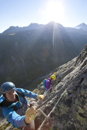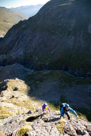 350 Höhenmeter (2.410 - 2.760 m) und 700 m Kletterlänge. Ca. 3 Stunden, mit dem Abstieg zur Langtalereck Hütte 4 Stunden.