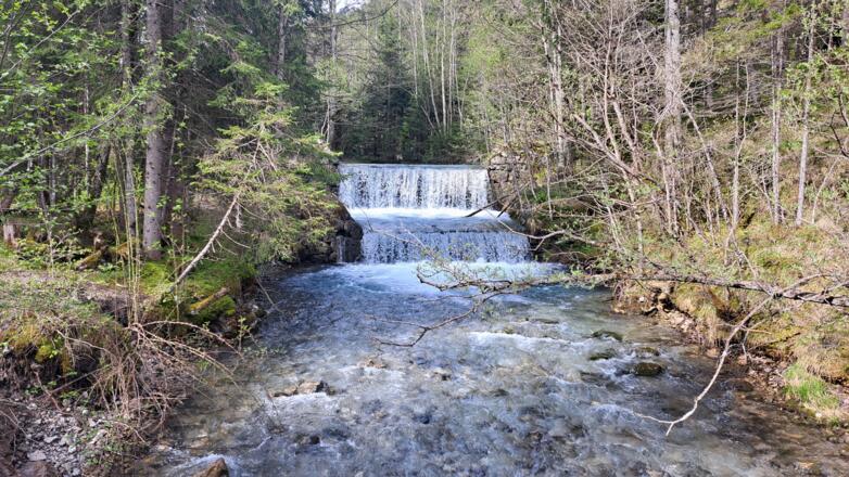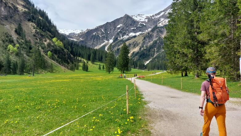 Der Weg führ uns zu erst auf der Straße durch Thannheim, zum Vilsalpsee. Kurz nach Ortsende wechseln wir auf einen breiten Waldweg zuerst rechts und später links der Straße. Kurz vor dem Vilsalpsee laufen wir die letzten Meter auf der Straße zum See. Der weg steigt bis hier kaum merklich an. Um den See herum laufen wir eben, bis wir zum Wasserfall abzweigen. Nun steigt der Weg doch leicht an. Ab dem Abzweig zur Landsbergerhütte geht es auf einem guten Pfad dann zügig ansteigend nach oben. Die Bäume werden schnell lichter und so gibt es kaum noch Schatten im Aufsieg zur Oberen Traualpe. Ab hier geht es auf dem Pfad weiter bis zum kurzen steilen Aufschwung, der gut mit Dratseilen abgesichert ist. Danach folgen wir dem schmalen Pfad nach rechts durch die Latschn mit kleinem kurzen Anstieg zur Hütte.