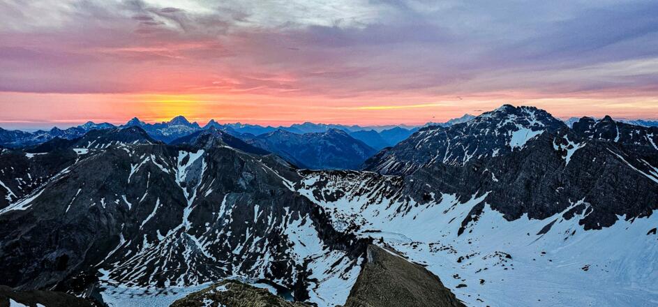 Noch vor dem Fühstück starten wir um zum Sonnenaufgang auf der Steinkarspitze und Rote Spitze zu sein. Pünktlich zum Frühstück waren wir wieder auf der Hütte. Weiter führt uns unser Weg vorbei an der Schochenspitze, die wegen Steinschlag gespert war, durch die Gappenfeldscharte und Strindenscharte. Die Sulzspitze lassen wir links liegen. Zügig erreichen wir nun den Neunerkopf. Nach einer Einkehr in der Gundhütte fahren wir mit der Bahn ins Tal zurück.