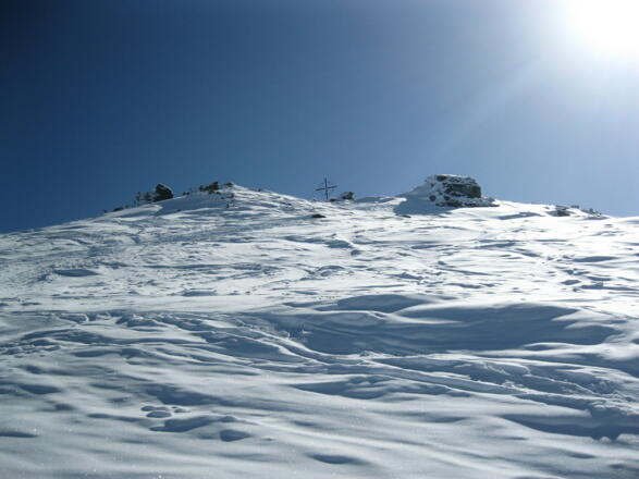 Über kleine Lichtungen und einige Male Forststraßen querend gelangt man zur Waldgrenze und von hier über traumhaftes Skigelände zum riesigen Gipfelkreuz.
