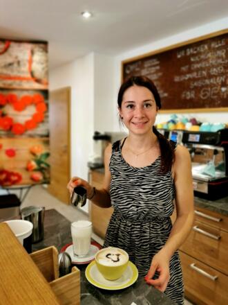 Der Zauber dieses Cafés wirkt schon viele Meter vor Erreichen der Eingangstür. Es ist der zarte betörende Blumenduft, der mich begrüßt und sofort eine angenehme Stimmung verbreitet. Im Blumenladen von Magdalena warten die Blumen auf ihren neuen Besitzer. Herrlich schöne und vor allem auch exotische Blumen sind dabei. Hinter dem Blumenabteil eröffnet sich dem Besucher dann das recht große Café. In der Auslage präsentieren sich prächtige selbst gebackene Kuchen. Schon jetzt ein Fest der Sinne. Und mittendrin Magdalena. Die Chefin und zauberhafte Seele des Hauses. Bei einem Glas erfrischend kühler Holunderblütenschorle vom selbst produzierten Holundersaft erzählt sie, dass sie im Trentino als Floristin tätig war und zwei Jahre später hierher zurückgekehrt ist und nicht nur einfach einen Blumenladen eröffnen wollte. Und so fragte sie ihre Mama, und zweite ebenso zauberhafte Seele des Cafés, ob sie ihr für den Blumenladen Kuchen backen würde. Das war 2014. Und heute ist Magdalena ein sehr beliebtes Café. Ob die Männer das Café nicht auch gerne besuchen um mit der Blume für ihre Liebe wieder nach Hause zu kommen, frage ich sie. Ja, das kommt sehr oft vor, sagt Magdalena und fügt noch schmunzelt hinzu: „Aber die Männer trinken dann doch lieber ein Bier statt einem Kaffee.“ Wie auch immer, kommen die Gäste hier immer wieder sehr gerne zurück. Sei es wegen den herrlichen Blumen für zu Hause, sei es wegen den riesigen und köstlichen Rouladenstücken oder einfach wegen der wundervollen Magdalena und ihrer Mama, die dem Blumencafé ihren wahren Zauber verleihen