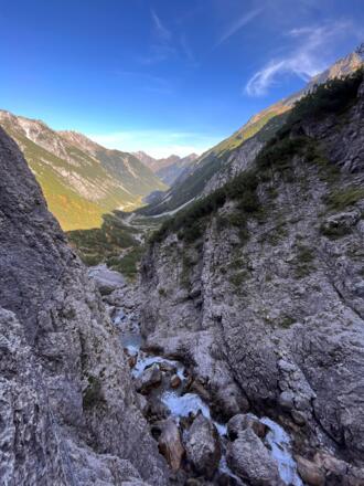 Von Boden aus startet man den Zustieg zum Start des Klettersteigs. Für etwa eine Stunde wanders mandas Tal entalng, geniesst die wunderschönen Ausblicke auf die Hanauer Hütte und die rund herum gelgenen Gipfel wie die Dremelspitze, Schneekarlespitze oder Parzinnspitze. Dabei überquert man einige Malde den Angerlebach.