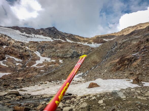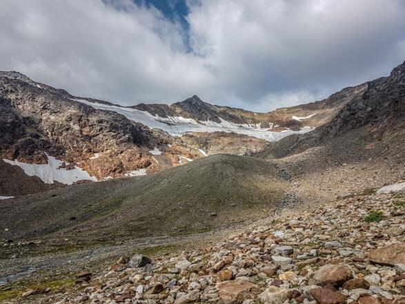 Der Weg führt durch das schottrige Moränengelände entlang des Baches vom Manigenbachgletscher, immer unterhalb der Lehnerkarschneide, bis man auf ca. 2780 Metern Höhe auf den Beginn einer markanten Moräne trifft.