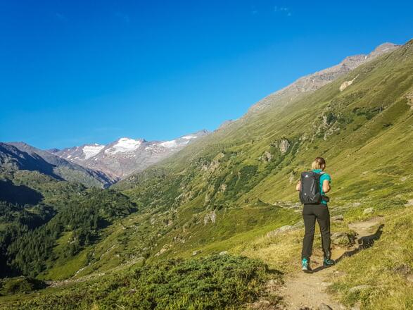 Wir starten direkt im Ortskern von Obergrugl und wandern vom südwestlichen Ortsrand am Weg Nr. 37 Richtung Ramolhaus. Nur langsam machen wir Höhenmeter. Der Steig zieht sich flach weit ins Tal hinein. Bis zur nicht bewirtschafteten Küppele Alm bleiben wir auf dem Weg.