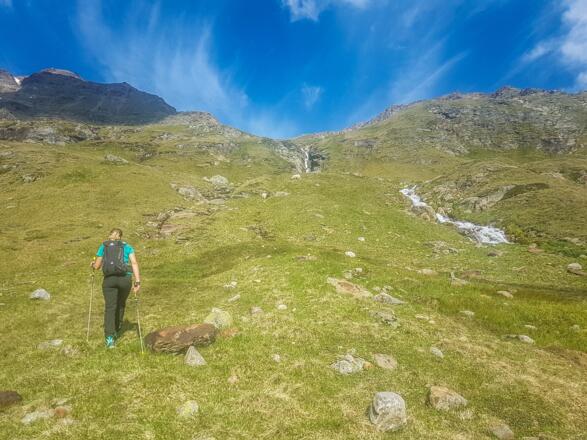 Wir halten uns zuerst links des Baches und überwinden eine Felsstufe, über die sein Wasser plätschert. Der Untergrund wird immer unwirtlicher, das Gras karger. Fels und Schotter knarren unter den Schuhen. Das Geröll ist gut verfestigt und angenehm zu gehen.