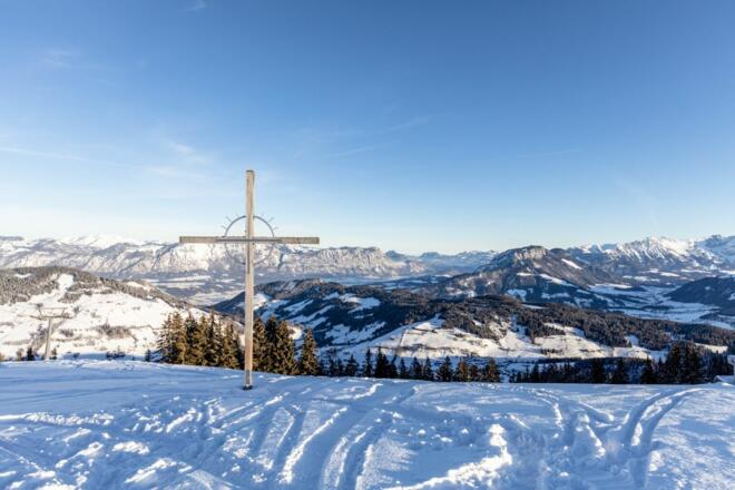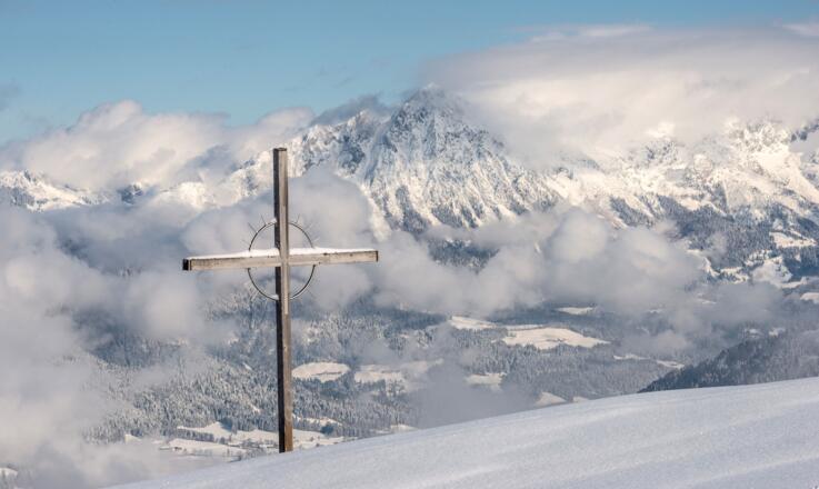 Gemütliche Auffahrt mit der Markbachjochbahn aufs Markbachjoch. Oben angekommen lässt sich erstmal die wunderbare Aussicht genießen - nicht weit weg neben der Bergstation steht ein schönes Kreuz mit Blick Richtung Norden.