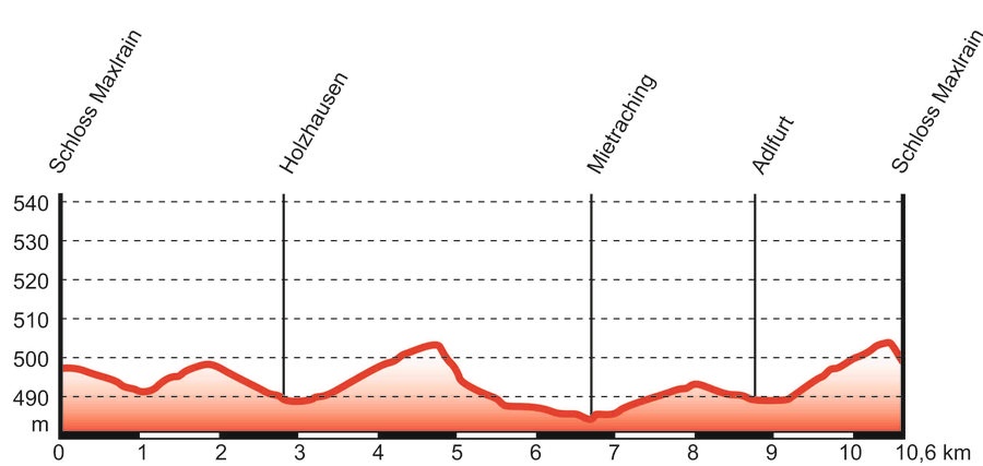 Vom Parkplatz Maxlrain am Schloss Maxlrain und Golfanlage vorbei an Fischbach und Holzhausen nach Heimatsberg. Von dort aus durch den Wald und über die Wiesen nach Mietraching. Weiter über die Moosbachwiesen nach Wilpasing. Querung der Straße und hinunter nach Adlfurt. Möglichkeit zum Abstecher zur Wallfahrtskirche Weihenlinden, oder zurück durch das Waldstück nach Maxlrain. Zustieg von Bad Aibling über Ai2 (3km)