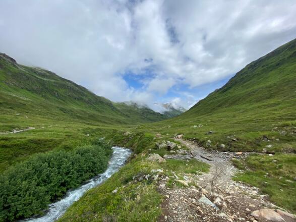 Vom Bahnhof in St. Anton geht es entlang des ausgeschilderten Radwegs ins Verwalltal. Die Neue Heilbronner Hütte ist bereits markiert. Einkehr bei der Konstanz Hütte möglich.