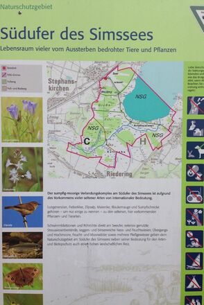 Der Simssee ist seit 1963 ein Landschaftsschutzgebiet, das Südufer mit Umgebung seit 1993 Naturschutzgebiet. Die Umgebung ist geprägt von unterschiedlichsten Landschaftsformen: Nieder-, Flach- und Hochmoore, Biotope und Auwälder sind Lebensraum für viele bedrohte und seltene Pflanzenarten vor malerischer Alpenkulisse.