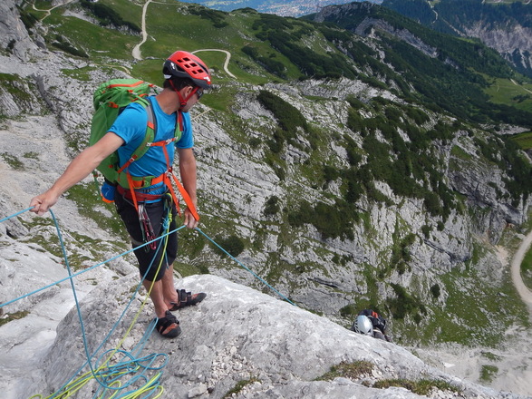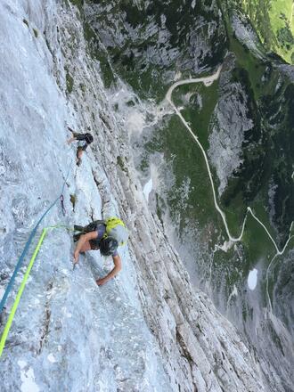 In überwiegend festem Fels führt diese Route durch die zentrale Nordwand der Alpsitze. Mit 15SL ist sie eine der längsten Routen in der Wand.