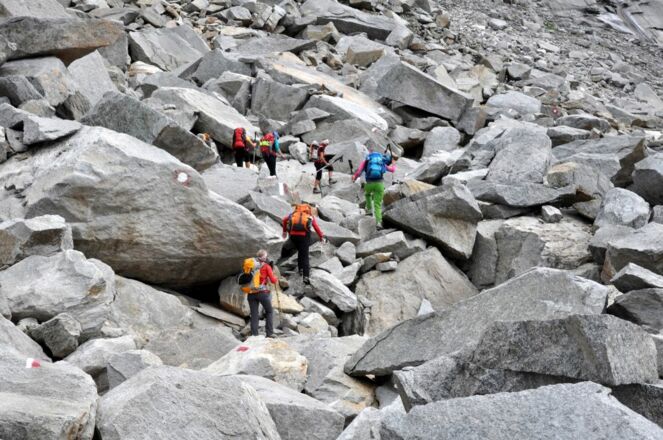 Auch wenn der reine Höhenunterschied zwischen Start und Ziel keine 200 Höhenmeter beträgt, kommen durch das viele Auf und Ab doch knapp 1500 Höhenmeter Aufstieg und fast 1600 Höhenmeter Abstieg zusammen. Dazwischen werden mit Altem Tauern, Messlingscharte, Haupmerscharte, Wilden Manderscharte und Granatscharte gleich fünf Scharten durchschritten. Die technisch anspruchsvollste ist die fast 3000 m hohe Granatscharte, die teilweise über Gletscher führt. Doch auch sonst führt der Weg über weite Strecken durch felsiges und verblocktes Gelände. Immer wieder helfen Seilversicherungen. Die Etappe endet mit einem leichten Klettersteig hinunter zum komfortablen Berghotel Rudolfshütte.