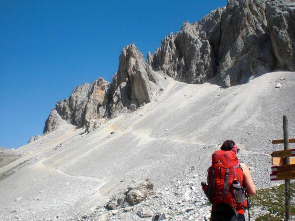 Die zweite Etappe über den Karnischen Höhenweg bzw. Friedensweg ist nochmals weit und reich an Gipfeloptionen. Zunächst unschwierig, später deutlich alpiner führt der Weg aussichtsreich über alte Kriegswege von der Porzehütte zur Obstanzersee Hütte. Auf etwa halber Strecke lockt eine Rast an der Standschützenhütte.