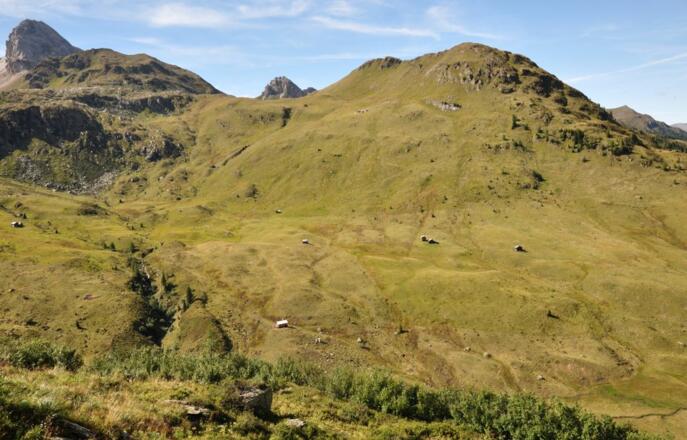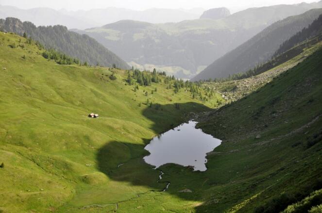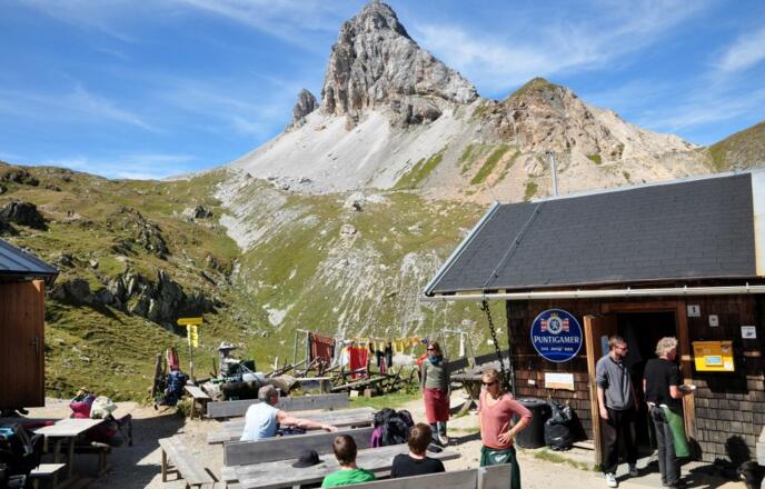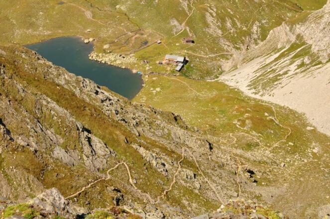 Von der Porzehütte (1942 m) zunächst sanft in leichtem Auf und Ab bis unter die Nordwändes des Porze. Diese querend führt der Weg bald ansteigend hinauf zum Heretriegel (2170 m). Von hier in Serpentinen hinunter zum Oberen Stuckensee (2032 m). Nun erneut bergauf zur Filmoor Standschützenhütte (2350 m). Einkehrmöglichkeit! Weiter aufsteigen über den Filmoorsattel in Richtung Große Kinigat. Die Schotterhänge unterhalb des Gipfels queren und über die Kinigat Scharte hinauf zum zweithöchsten Punkt der Etappe wenig unterhalb der Kleinen Kinigat. Alternative für Geübte: Überschreitung der Großen Kinigat (2689 m) auf leichtem Klettersteig. Der Abstieg trifft an der Kinigat Scharte wieder auf den Originalweg. Von der Kleinen Kinigat kurz abwärts. Dann am Grat entlang zur Pfannspitze (2678 m) aufsteigen. Vom höchsten Punkt der Etappe über den Grat absteigen bis zu einer Wegverzweigung. Hier direkt rechts bergab. In steilen Kehren führt der Weg durch Schutthänge hinab zur Obstanzersee Hütte (2304 m) am gleichnamigen See.