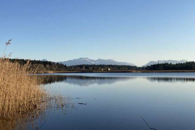 Wieder an der Kreuzung angekommen, folgen wir der Straße nach Oberbrunn, die an einer Gärtnerei vorbeiführt. In Oberbrunn biegen wir rechts nach Eschenau ab. Am Reiterhof Pfannes vorbei geht es nun auf der sogenannten Panoramastraße mit herrlichem Gebirgsblick bis zu dem kleinen Dörfchen, von wo aus wir außerdem einen schönen Blick über die vom Chiemsee geschaffene Seen- und Moorlandschaft haben. Eine kleine Sandstraße führt zum Eschenauer See hinab. Dieser ist ein Überbleibsel des Urchiemsees und bietet sich zu einem erfrischenden Bad an.