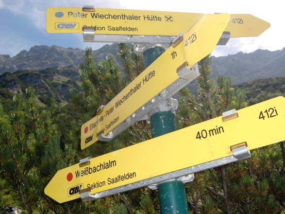 Von der Peter Wiechenthaler Hütte geht man Richtung Seilbahnstation, im Blickfeld das Persailhorn und folgt dem schönen Wanderweg der zur Weißbachlscharte führt. Der Ausblick reicht vom Birnhorn in den Leoganger Steinbergen im Westen, zu Schartenkopf, Hollermaishorn und Schindlköpfe im Norden bis zur imposanten Westwand des Persailhorns. Das Hinweisschild zeigt uns die Abzweigung, der Weg führt nun abwärts und ein weiterer Wegweiser zeigt uns den Pfad zur Weißbachlalm. Eine Rast hier lohnt sich allemal und zurück geht es via Ellaquelle , vorbei an den Wassertanks wieder zurück zur Peter Wiechenthaler Hütte. Es ist nur ein kurzes Stück mit Seilen versichert, aufzupassen wäre noch dass man sich nach etwa 2/3 des Weges zurück zur Peter Wiechenthaler Hütte bei einer Weggabelung nicht verleiten lässt den breiteren Weg zu nehmen, dieser ist für den Viehtrieb. Der richtige biegt beim Stein links nach oben ab. In 2 Stunden ist diese Hüttenwanderung leicht zu schaffen und ist auch umgekehrt wunderschön.