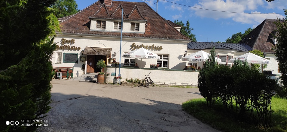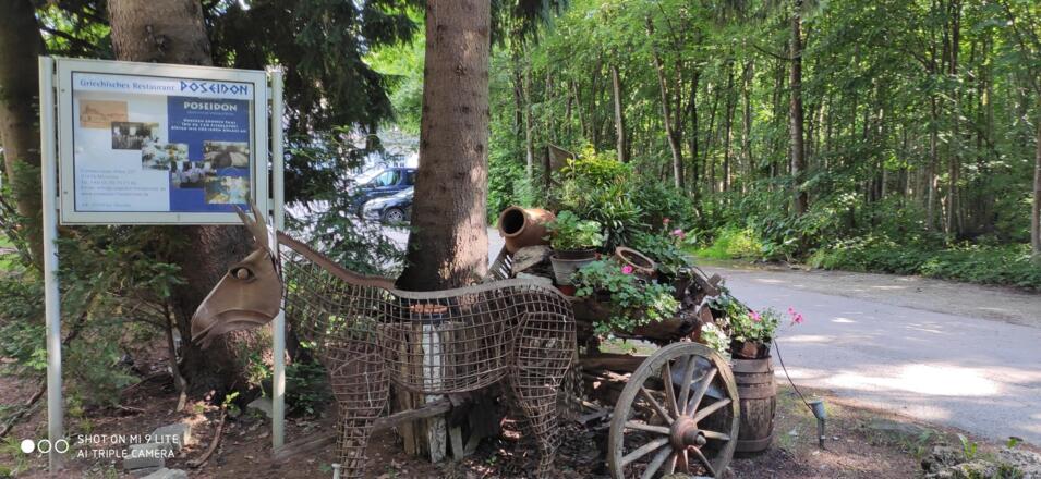 Im zu Beginn des 20. Jahrhunderts erbauten Forsthaus Hubertus lädt heute ein Grieche / Biergarten zum verweilen ein.
