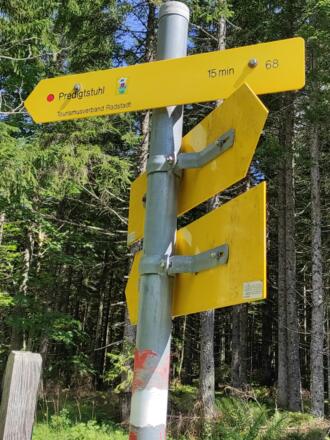 Gegenüber vom Gasthof Unterreith folgen wir zuerst der Beschilderung des Fitnesparcours. Nach den Stiegen zweigen wir links ab zum Schabelbergweg. Diesem folgen wir bis zur Abzweigung Steinwand. Bis zur Forststraße wird es etwas steiler. Auf dieser wenden wir uns nach rechts. Bald sehen wir das Panorama des Dachsteinmassivs. Kurz darauf geht es nach links Richtung Seitenalm. Nun können wir bei der Kreuzung auf der unmarkierten Forstsraße geradeaus gehen, um auf den Gipfel des Predigtstuhls zu kommen. Aussichtsreicher ist es kurz Richtung Seitenalm und dem Schild Predigtstuhl zu folgen. Hier lädt uns eine Bank zur Rast ein mit schönem Ausblick zum Rossbrand und über das Ennstal.