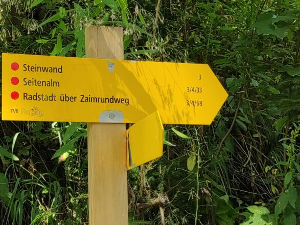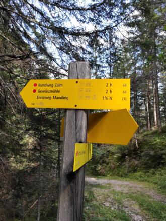 Wir gehen kurz zurück zum Rundweg Zneim und die Forststraße hinunter zur Abzweigung Heimelscharte. Hier beginnt ein schöner Steig zur Scharte. Von dort geht es rechts weiter Richtung Forstau und dann folgen wir dem Schild Auwald. Das letzte Stück treffen wir wieder auf Forsti`s Fitnessweg, welcher uns zum Ausgangspunkt zurückführt.