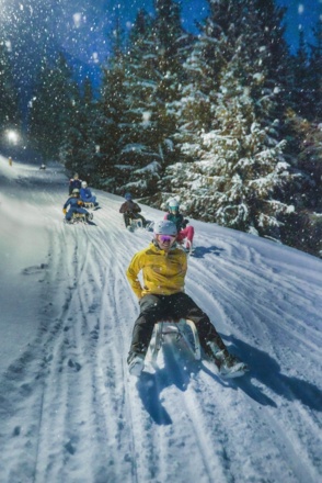 Durch eine idyllische Winterlandschaft fährt man mit dem Pistenraupen-Shuttle bis zum Spielberghaus auf 1.311 m. Nach einer Einkehr geht es auf Rodeln über die drei Kilometer lange beleuchtete Naturrodelbahn zurück ins Tal.