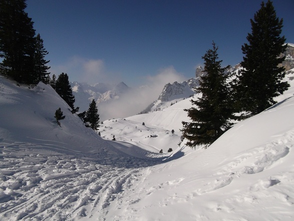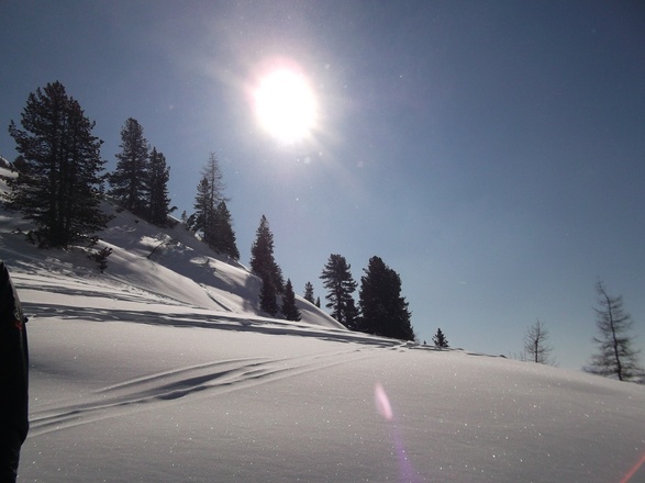 Landschaftlich schöne, kurze Rundtour ( ca. 1,5 h ) mit kurzen Steigungen und einigen Hängen zum Hinunterlaufen. Ideal zum Erlernen der Fortbewegung mit Schneeschuhen.