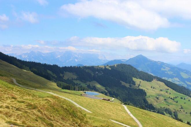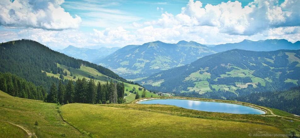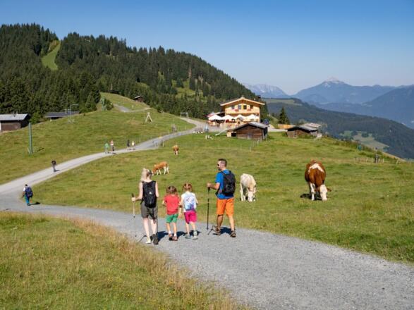 Mit der Markbachjochbahn geht es von Niederau aus hoch. Hier bietet sich eine herrliche Aussicht auf die Niederau und zusätzlich auf die steilen Gipfel des Wilden Kaisers. Dann vorbei an der Markbachjochalm zur Norderbergalm - bekannt für Ihren guten Kaiserschmarrn. Dann zur Roßkopfhütte und zur Horlerstiegl. Im Frühling findet man hier herrliche Wiesen mit weißen und violetten Krokussen. An den Bachläufen sind leuchtend gelbe Trollblumen zu sehen. Danach vorbei an der Holzalm/Käsealm, hier kann man selbstgemachten Käse und Buttermilch genießen, wieder retour durch den Wald zur Markbachjochbahn.