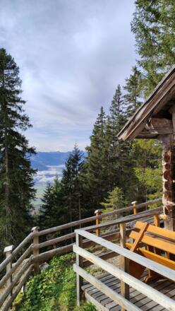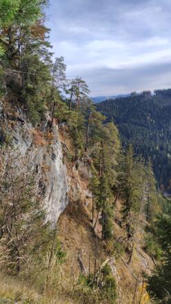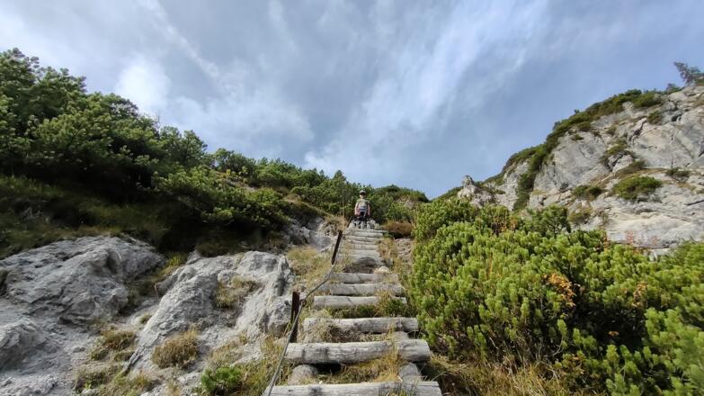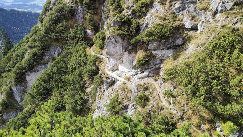 Diese querend und wieder leicht bergauf gelangt man an einen Aussichtspunkt. Von dort wieder weiter bergauf (Wegweiser "Steinalm") unter den Felsriegel der Steinalm/den Steinkarl. Dieser Weg ist mit einigen Versicherungen, Brücken und Leitern ausgestattet.