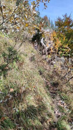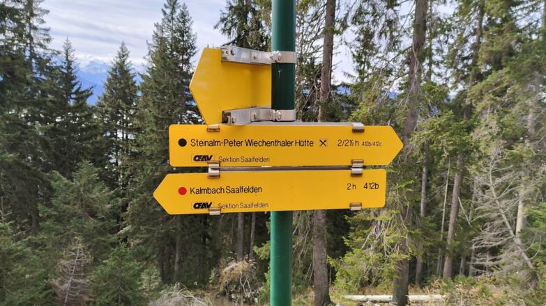Auf ca. 1.270m an einem Aussichtsbankerl nicht nach links abzweigen und 412b zur Steinalm folgen sondern weiter bergauf und etwas unterhalb der Haidensperre mit dem Weg in den Wald abbiegen bis die Kehre eines Forstwegs erreicht wird. Den Weg an dieser Stelle queren und vis a vis wieder verlassen und weiter dem Weg im Wald folgen bis die kleine Hochkendlhütte erreicht wird. Der Forstweg ist an dieser Stelle relativ neu (Ende 2023) und die Abzweigungen noch nicht beschildert.