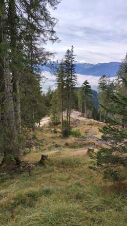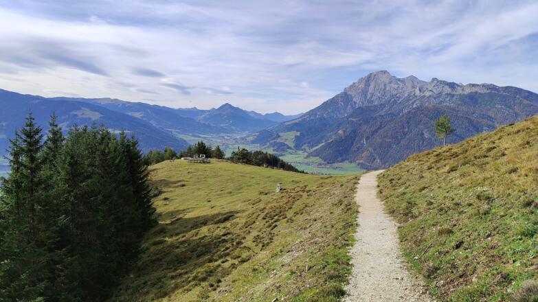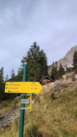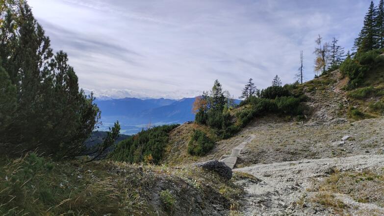 Nach etwa 20 Minuten nicht der Verlockung bergauf und durch die Felsen weiter zu steigen folgen sondern die Wegmarkierung mit Pfeil nach unten beachten. Der Weg umgeht den Steinkarl relativ weit unten und man verliert hier viel Höhe. Davon nicht abbringen lassen und dem Steig weiter bis zur Einmündung aus dem Überlackerweg folgen bis weiter die Steinalm erreicht wird.
