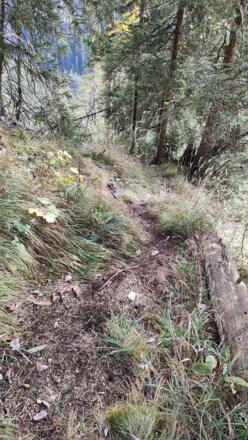 Der Weg führt an der Hochkendlhütte vorbei wieder nach Westen und fällt relativ kurz nach der Hütte steil in den Graben zur Haidensperre ab.
