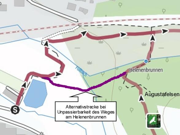Das Wegstück zwischen Helenenquelle und Bahnlinie ist zweitweise nicht begehbar, da es wegen ständig wechselnden Biberdämmen überflutet sein kann. In diesem Fall können wir von der Helenenquelle bis zum vorhergehenden Wegweiser (an den drei Stufen) zurück und dort (nicht dem Wegweiser folgend) geradeaus gehen. Am Waldrand angekommen sehen wir schon das Gebäude des Beach-Volleyball-Geländes, wo der Startpunkt war. Es ist nur noch die Wiese zu überqueren. Eine Grafik zu einer Alternativroute finden man auch in den Bildern zur Tour.