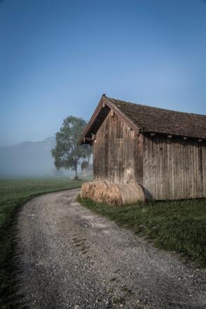Vorbei an einem alten Einödhof gehen wir auf einer gepflasterten Straße bis zum Ortsteil "Ort" und dann entlang am Bahngleis zurück nach Kochel a. See, wo in einem der Lokale eine schöne Brotzeit wartet.