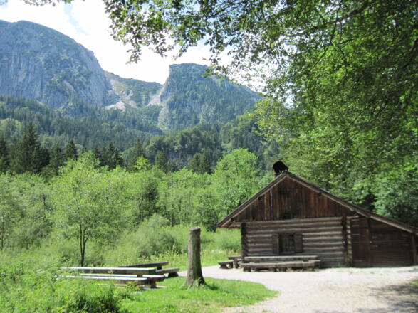 Dort bleiben Sie links auf der weiterhin ansteigenden Forststraße. Bei der folgenden Abzweigung rechts auf der Haupttrasse aufwärts. Bei der nächsten Gabelung zweigen Sie links ab, um bald darauf den Sattel (875 m) zwischen dem Waldhügel der Hohen Lueg und dem 1.538 m hohen, felsigen Hinteren Spielberg zu überqueren. Dahinter endet die Straße und es geht auf dem Jägersteig weiter. Dieser markierte Waldpfad führt stellenweise steil bergab, bis Sie im Mudelgraben eine weitere Forststraße erreichen. Diese führt hinab zur Großalmstraße, auf der Sie nur wenige Schritte links zur Taferlklause (780 m) gehen. Hinter der Brücke liegt der kleine, romantische Taferlklaussee, der einst für die Holztrift am Fuße des Höllengebirges angelegt wurde. 3:00 h
