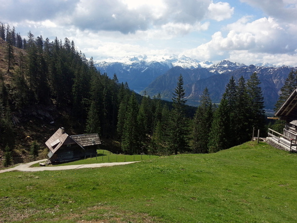 Ein Blick zum Dachsteingletscher in dieser schönen Almregion entschädigt die Anstrengung über die bisher abgestrampelten 690 HM.