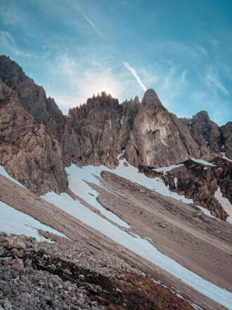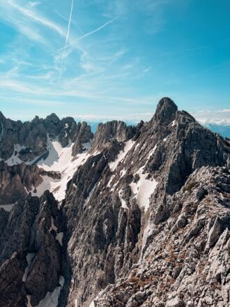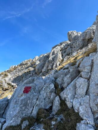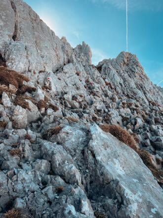 Vom Ellmauer Tor nach rechts den roten Markierungen folgend über brösliges Gestein bergauf. Eine kurze Steilstufe ist mit einer Kette gesichert. Anschließend führt uns der Pfad in Serpentinen dem Gipfel entgegen. Über eine kleine Kletterstelle zum Kreuz und dem Gipfel mit fantastischem Rundblick.