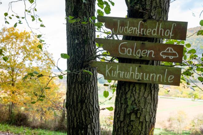Ungefähr 500 Meter vor Erreichen des Wanderparkplatzes „Galgen“ (der Rundweg 2 macht an dieser Stelle einen scharfen Knick nach rechts) sehen Sie auf der rechten Seite des Weges die Mauern und den Eingang des im Jahre 1730 angelegten Jüdischen Friedhofs. Wenn Sie diesen besuchen möchten, können Sie den Schlüssel vorab in der Marktgemeinde Kleinheubach abholen. (Bitte beachten Sie die Öffnungszeiten der Marktgemeinde).