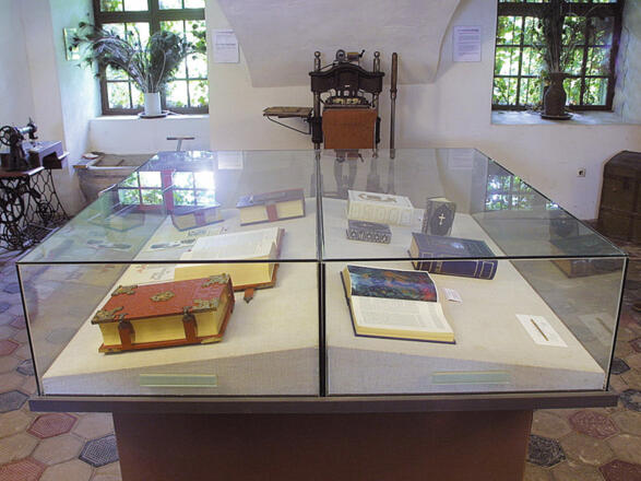 ⚜ Im Erdgeschoss des Schlosses ist ein Gebetbuch- und Buchbindereimuseum eingerichtet, in dem prachtvolle Bibeln, Gebetbücher sowie Taschenkalender gezeigt werden. Wesentliche Bestandteile der Ausstellung sind auch einige alte Buchbindereimaschinen und Werkzeuge. Das Museum dokumentiert die Verlags- und Buchbindereigeschichte des ehemaligen Unternehmens Johann Steinbrener, der zu seiner Glanzzeit bis zu 1000 Mitarbeiter beschäftigte und in über 65 Ländern Niederlassungen hatte.